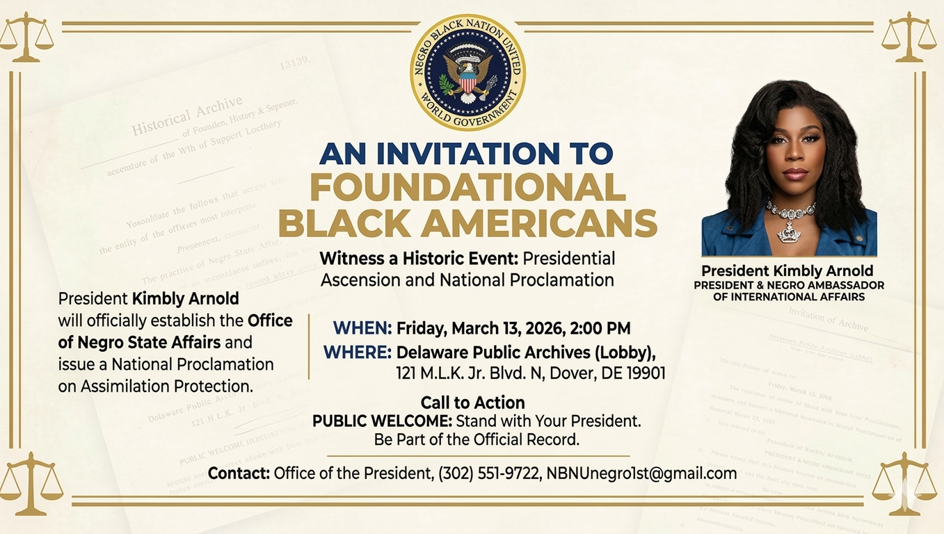AN INVITATION TO FOUNDATIONAL BLACK AMERICANS Delaware Public Archives (Lobby) President Kimbly Arnold will officially establish the Office of Negro State Affairs and issue a National Proclamation on Assimilation Protection. Office of the President: (302) 551-9722 Email: NBNUnegro1st@gmail.com #NBNUWorldGoverment #TNBKHC #Delineation #Delineationology #NBNU